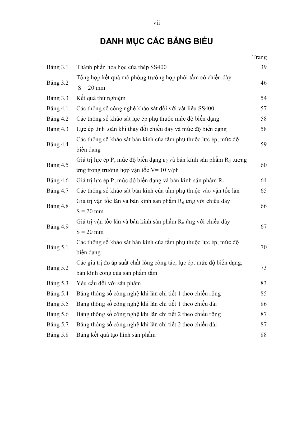 ng, đường kính lỗ rỗng 38 là 100 mm. Việc con lăn có lỗ rỗng hoàn toàn không ảnh hưởng đến kết quả mô phỏng, tuy nhiên sẽ tiết kiệm được thời gian tính toán. Phôi tấm dạng dải có kích thức 600 mm x 80 mm x 20 mm. Chiều dài và chiều rộng phôi tấm được lựa chọn như trên đảm bảo cho quá trình khảo sát biến dạng theo phương dọc và ngang của phôi. Trong thực tế tạo hình, các chi tiết vỏ tàu thuỷ thường có kích thước lớn hơn kích thước phôi tấm được lựa chọn để mô phỏng. Tuy nhiên, việc lựa chọn này không làm ảnh hưởng nhiều đến kết quả sau này sẽ ứng dụng trong thực tế bởi: - Lăn ép tạo ra biến dạng cục bộ liên tục trên phôi tấm dọc theo đường lăn. Biến dạng chủ yếu xảy ra trong vùng tiếp xúc giữa 2 con lăn với phôi tấm, nên ta có thể lựa chọn kích thước theo chiều rộng phôi tấm lớn hơn kích thước của vết tiếp xúc giữa con lăn với phôi tấm. Tại hai mặt biên theo chiều rộng tấm, coi như biến dạng theo chiều rộng bằng không. - Với chiều dài tấm 600 mm đủ để khảo sát ảnh hưởng của các thông số công nghệ đến biến dạng cong của tấm. Chiều dài lớn quá sẽ lãng phí thời gian tính toán. - Chiều dày của phôi tấm sẽ thay đổi tuỳ thuộc vào mục đích khảo sát tạo hình phôi tấm có chiều dày từ 10 mm đến 30 mm. 3.3.2 Chia lưới phần tử Hình 3.3 Lưới phần tử của cặp con lăn và phôi tấm Chia lưới cho phôi, con lăn đảm bảo độ chính xác của kết quả, tuy nhiên cũng cần lưu ý đến thời gian tính toán mô phỏng. Nếu chia nhiều phần tử, kết quả mô phỏng sẽ chính xác nhưng thời gian tính toán sẽ lâu, khi phần tử quá nhỏ thì có thể sẽ khó hội tụ hoặc không hội tụ do giá trị chênh lệch giữa các nút kề nhau vượt quá sai số tính toán. Nếu chia ít phần tử, việc tính toán sẽ nhanh, nhưng độ chính xác bị giảm đi. Số lượng phần tử phù hợp sẽ được xác định bằng cách tính toán mô phỏng với số lượng phần tử ban đầu ít, sau đó tăng dần lên cho đến khi kết quả tính toán không có sự chênh lệch nữa. Do con lăn chỉ bị biến dạng đàn hồi nên ta chia lưới con lăn dưới 18.000 phần tử, con lăn trên cần 39 chính xác về biên dạng nên ta chia 22.000 phần tử. Mặc dù phôi tấm có dạng dải, tiết diện ngang hình chữ nhật đơn giản, nhưng do phôi biến dạng dẻo, nên chia với 26.000 phần tử. Kiểu phần tử được lựa chọn là C3D8R. Đây là phần tử khối, 8 nút, cho phép tính toán ứng suất, biến dạng, chuyển vị của từng nút nên đáp ứng được với mục đích đặt ra cho bài toán mô phỏng. 3.3.3 Xây dựng mối quan hệ giữa ứng suất và biến dạng của vật liệu Việc xác định chính xác mô hình vật liệu để đưa vào mô phỏng số rất quan trọng và ảnh hưởng trực tiếp đến kết quả mô phỏng số. Vật liệu trục lăn được lựa chọn là thép C45 có các thông số tra từ sổ tay vật liệu học và đối chiếu với các thông số được lấy ra từ thư viện vật liệu đã có sẵn trong phần mềm. Vật liệu thép tấm được lựa chọn theo tiêu chuẩn JIS G 3101 có mác SS400. Đây là vật liệu thép được dùng rất phổ biến trong chế tạo vỏ tàu thủy và có thành phần hóa học như trong bảng 3.1. Bảng 3.1 Thành phần hóa học của thép SS400 Thép Thành phần hóa học (%) C Si Mn Ni Cr P S SS400 0.11- 0.18 0.12- 0.17 0.40- 0.57 0.03 0.02 0.02 0.03 Để mô phỏng số quá trình lăn ép, cần thiết phải đưa các thông số vật liệu vào phần mềm. Ngoài các thông số vật liệu cơ bản, cần đưa vào đường cong quan hệ giữa ứng suất và biến dạng của vật liệu [10, 11, 12, 27, 65, 67]. Phần mềm Abaqus chấp nhận hai cách đưa mô hình thuộc tính dưới dạng hàm số hoặc bảng số liệu. Vì bài toán tấm biến dạng nguội nên cần quan tâm cả miền đàn hồi của vật liệu. Khi thực hiện thử kéo mẫu vật liệu sẽ đo cả vùng biến dạng đàn hồi. Hình 3.4 Mẫu thử kéo Mẫu thí nghiệm kéo có kích thước như hình 3.4, được lấy ra từ các tấm theo 3 phương gồm: Phương cán, phương ngang (vuông góc với phương cán) và theo phương nghiêng 45 0 so với hướng cán. Mẫu thử kéo được tiến hành tại Viện công nghệ - Bộ quốc phòng, trên máy TT-HW2-1000. 40 Kết quả thử kéo 3 mẫu theo 3 phương khác nhau đối với cùng một tấm vật liệu được thể hiện trên hình 3.5. Hình 3.5 Đường cong lực - chuyển vị khi thử kéo của vật liệu SS400 Dựa trên kết quả thử kéo có thể nhận thấy rằng mối quan hệ giữa lực kéo và chuyển vị hay ứng suất chảy và mức độ biến dạng theo 3 hướng thí nghiệm trùng nhau trong miền biến dạng đàn hồi, biến dạng dẻo do đó ta có thể coi vật liệu là đẳng hướng. Từ đường cong quan hệ giữa lực - chuyển vị trong thử kéo, xây dựng đường cong quan hệ giữa ứng suất và biến dạng của vật liệu và đưa đường cong này vào phần mềm mô phỏng số (hình 3.6). Hình 3.6 Đường cong quan hệ giữa ứng suất và biến dạng của vật liệu SS400 3.3.4 Đặt điều kiện biên Theo s