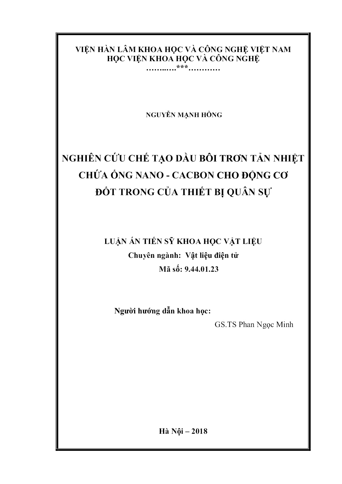 Bạn đang xem 10 trang mẫu của tài liệu "Luận án Nghiên cứu chế tạo dầu bôi trơn tản nhiệt chứa ống nano-cacbon cho động cơ đốt trong của thiết bị quân sự", để tải tài liệu gốc về máy hãy click vào nút Download ở trên.
