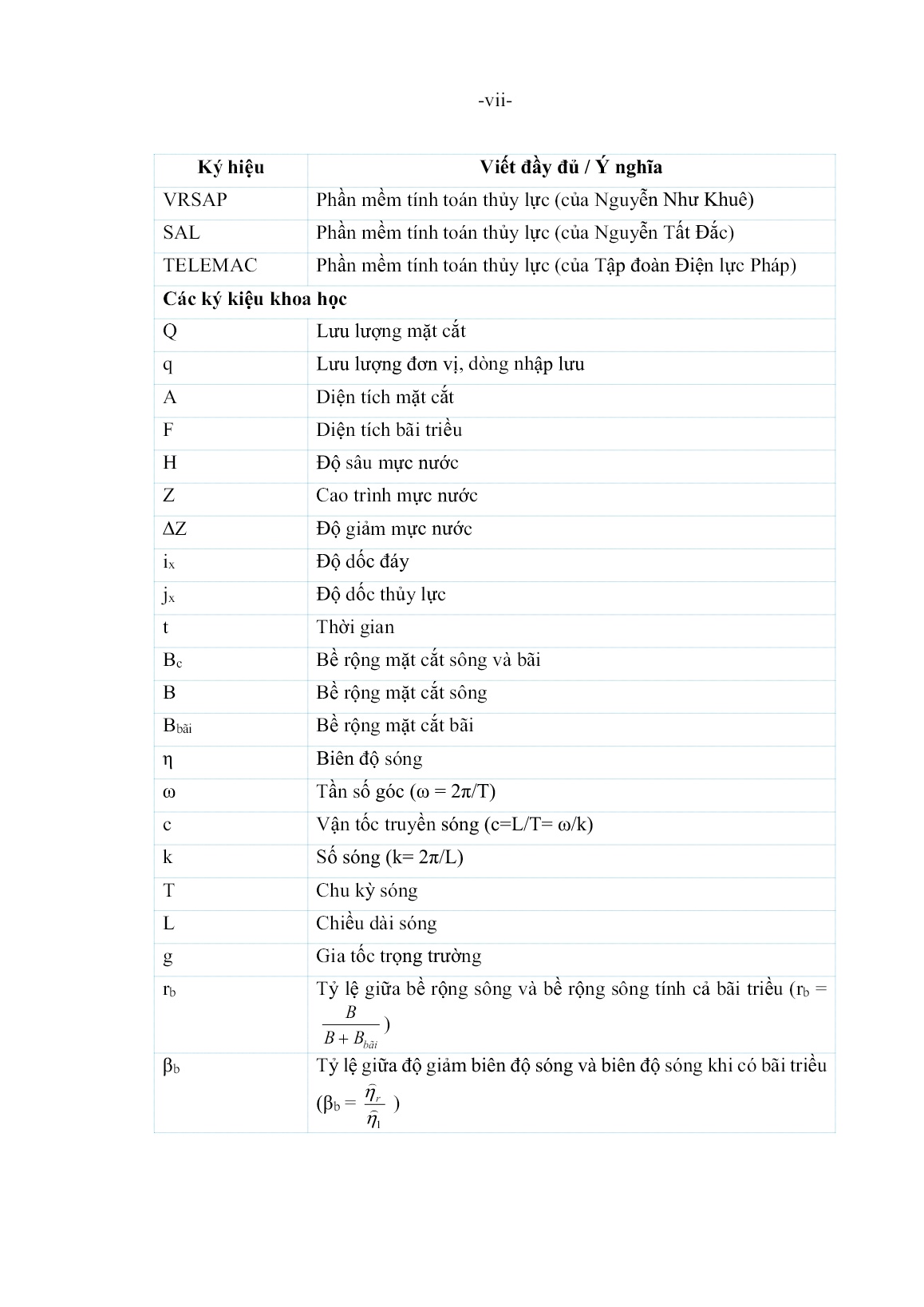 rình cân bằng khối lượng chất lỏng dẫn tới: q2=q1-qr với q = cη Như vậy: rccc 11122 (2.10) Tại bậc đáy thấp, biên độ sóng bằng nhau ta có: r 12 (2.11) Hình 2-3: Minh hoạ phản xạ sóng do độ sâu thay đổi Thay (2.10) vào (2.11), biên độ sóng gia tăng lên so với trường hợp không bị phản xạ như sau: Mực nước trung bình Sóng đến và bị phản xạ η2 Sóng đến η1 ηr qr q1 q2 η2 η1 -50- 21 21 1 cc cc r Tương tự, xét trong trường hợp sóng bị thay đổi do vào trong sông có xét đến phần bãi triều ven sông, lúc này sóng bị hấp thụ bởi các bãi triều (Hình 2-4). Theo phương trình cân bằng khối lượng chất lỏng cũng dẫn tới: q2=q1-qr Và: rccc 11122 Tại bậc đáy thấp, biên độ sóng bằng nhau ta có: r 12 Biên độ sóng giảm đi so với trường hợp không có bãi triều như sau: 21 21 1 cc cc r (2.12) Thay giá trị c trong (2.9) vào phương trình (2.12) ta được: bãi bãi r BB BgH gH BB BgH gH 2 1 2 1 1 (2.13) Do lòng sâu sâu nên có thế coi cao trình mực nước (H1 = H2), khi đó (2.13) trở thành: bãi bãi r BB B BB B 1 1 1 (2.14) Nếu đặt: rb = bãiBB B (2.15) Trong đó: rb là tỷ lệ giữa bề rộng sông và bề rộng sông tính cả bãi triều. Tỷ lệ này càng nhỏ thì bãi triều càng lớn (0 < rb ≤ 1). Thì phương trình thay (2.15) vào (2.14) phương trình trở thành: b b r r r 1 1 1 (2.16) -51- Theo phương trình (2.16), với bề rộng sông (B) và độ sâu cột nước (H) không đổi, thì bề rộng bãi càng lớn trị số rb càng nhỏ và trị số 21 21 cc cc trong phương trình (2.12) càng lớn dẫn đến biên độ sóng ηr càng giảm nhiều làm cho mực nước đỉnh triều hạ thấp, chân triều cao lên. 2.1.3. Tác động của bãi triều đến lưu lượng Về lưu lượng lòng dẫn khi có bãi, lưu lượng sau khi qua bãi triều (ở thượng lưu bãi triều) giảm đi với trị số qr như sau: bãi bãi r BB B BB B gHq 1 1 11 (2.17) Thì phương trình thay (2.15) vào (2.17) phương trình trở thành: b b r r r gHq 1 1 11 (2.18) Hình 2-4: Minh hoạ bị hấp thụ sóng do bãi triều thay đổi Mực nước trung bình Sóng đến η2 Sóng đến và bị hấp thụ η1 ηr qr q1 q2 η2 η1 B Bc Bbãi -52- Nếu viết dưới dạng không thứ nguyên, và đặt βb = 1 r (tỷ lệ giữa độ giảm biên độ sóng và biên độ sóng khi có bãi triều, (-1 < βb ≤ 0), βb có thể viết như sau: βb = b b r rr r r gH q 1 1 11 (2.19) Một ví dụ với số liệu cụ thể cho phương trình (2.16), (2.18) và (2.19): Giả thiết bề rộng sông B = 1.000 m; biên độ triều η1 = 1,5 m; độ sâu mực nước H = 10 m, bề rộng bãi triều được giả định từ 100 m đến 1000 m. Hình 2-5: Quan hệ giữa bề rộng bãi triều với độ giảm biên độ triều và lưu lượng đơn vị vào bãi triều Theo kết quả tính toán, bề rộng bãi triều càng lớn thì biên độ triều giảm càng nhiều, lưu lượng vào (qr) bãi triều càng lớn (Hình 2-5). Nếu xét về hệ số rb, hệ số này càng nhỏ thì thì biên độ triều giảm càng lớn (Hình 2-6). Khi phân tích không thứ nguyên, tỷ lệ rb càng nhỏ (bãi triều càng lớn) thì tỷ lệ βb càng nhỏ (độ giảm mực nước lớn nhất càng nhiều) (Hình 2-7). -53- Hình 2-6: Quan hệ giữa rb với độ giảm biên độ triều và lưu lượng vào bãi triều Hình 2-7: Quan hệ giữa rb với βb Các phân tích cụ thể về cơ sở lý thuyết đã minh chứng tác động của bãi triều đến mực nước trên sông khá rõ ràng. Tuy nhiên, trong điều kiện thực tế, các bãi triều có thể nằm ven sông, có thể nằm trong các sông nhánh (Hình 2-8) và quá trình phân tích tính toán phức tạp hơn nhiều. Trường hợp này có thể coi kênh nhánh đổ ra sông như -54- một dòng nhập lưu. Theo phương trình (2.5) thì khi có thêm dòng nhập lưu với lưu lượng âm khi triều lên thì mực nước trên sông giảm đi và điều này được minh chứng và kiểm nghiệm lại trong quá trình phân tích và tính toán bằng mô hình toán số trong nghiên cứu này. Hình 2-8: Bãi triều ven sông và bãi triều trong dòng nhập lưu 2.1.4. Tác động của mặt cắt lòng dẫn đến mực nước và lưu lượng Đối với trường hợp mở rộng lòng dẫn, như ta đã biết khi mở rộng mặt cắt theo chiều ngang hoặc chiều sâu thì lưu lượng trong sông (khi chưa mở rộng mặt cắt q1) nhỏ hơn lưu lượng trong sông (khi mở rộng mặt cắt q2): q1 < q2. Theo công thức truyền sóng (2.7): c = cB Ag , và trong trường hợp không có bãi triều (B = Bc), lòng dẫn là chữ nhật thì: c = gH và q = η gH = η )( oHg (2.19) Xét trong hai trường hợp trên ta có: q1 = c1η1 = η1 )( 1 oHg (2.20) q2 = c2η2 = η2 )( 2 oHg (2.21) -55- Như vậy, nếu q2 > q1 thì theo phương trình (2.20) và (2.21); η2 > η1 và việc mở rộng mặt cắt lòng dẫn làm cho biên độ triều tăng lên. Mực nước nước lớn nhất gia tăng và mực nước nhỏ nhất giảm đi. 2.2. TÀI LIỆU PHỤC VỤ NGHIÊN CỨU Các số liệu chủ yếu được thu thập phục vụ cho công tác nghiên cứu được trình bày dưới đây: 2.2.1. Tài liệu địa hình Tài liệu này phục vụ cho việc phân tích đánh giá các bãi triều hiện có trong vùng nghiên cứu; xây dựng mô hình thuỷ lực 1 chiều và 2 chiều. Số liệu địa hình bao gồm: - Địa hình m