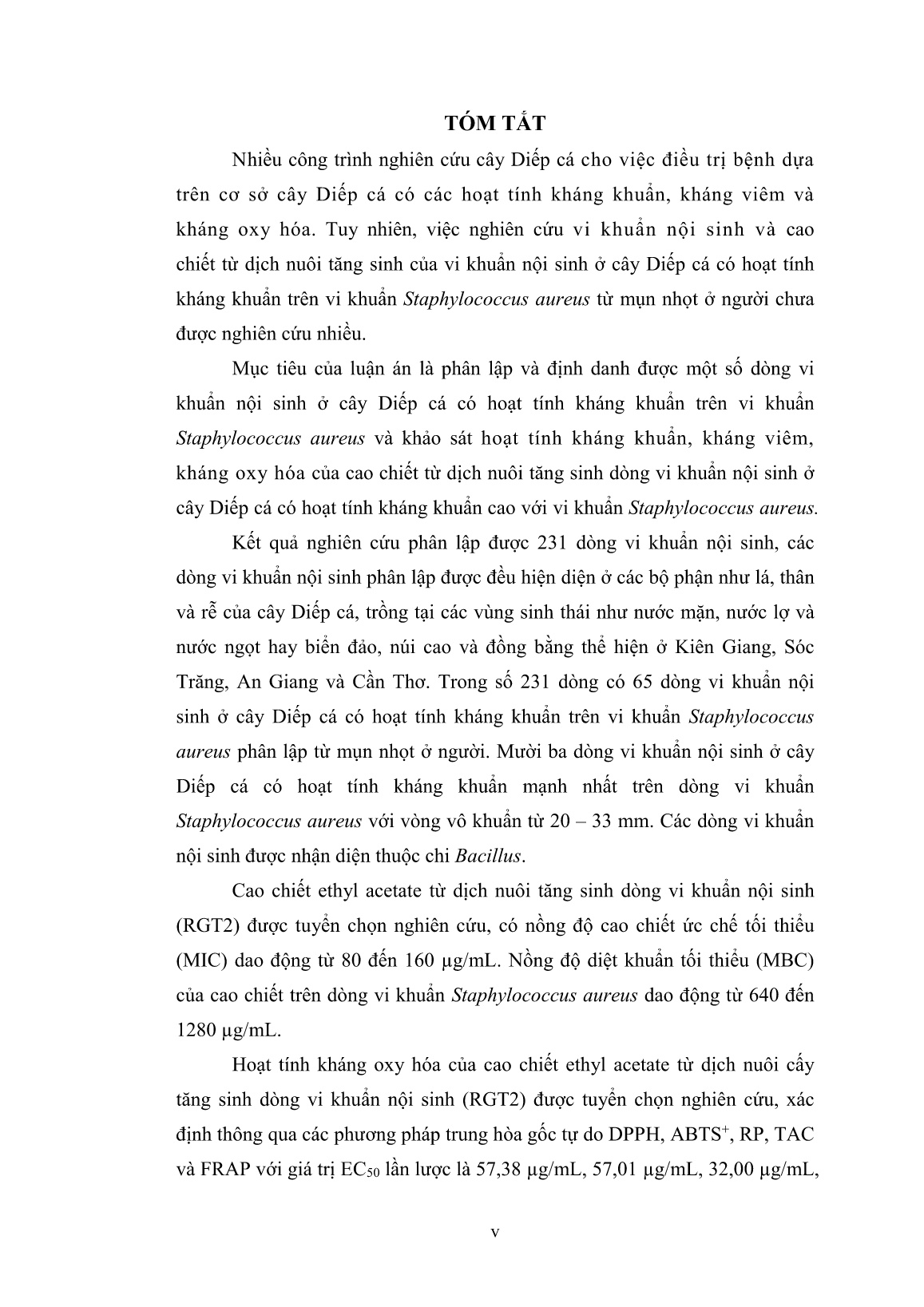 Luận án Nghiên cứu vi khuẩn nội sinh ở cây diếp cá (houttuynia cordata thunb.) có hoạt tính kháng khuẩn trên vi khuẩn staphylococcus aureus từ mụn nhọt (furuncle) ở người