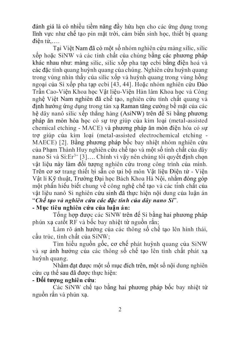 lớp tối ưu là 10 nm cần thiết để chế tạo các SiNW. Ngoài ra S. Leela và đồng nghiệp [59] tổng hợp SiNW bằng phương pháp PECVD sử dụng kim loại xúc tác Au, chỉ ra rằng độ dày lớp xúc tác ảnh hưởng đến kích thước SiNW. Quan sát trên ảnh SEM thể hiện 7 ở Hình 2.13 đối với các mẫu dây Si chúng tôi chế tạo được với độ dày lớp xúc tác Au khác nhau, SiNW hình thành có kích thước to nhỏ đan xen nhau trong khoảng từ 10÷50 nm đồng thời mật độ hình thành ở các vị trí không đồng đều. Kết quả hình thái bề mặt của SiNW cho thấy kích thước cũng như mật độ SiNW phụ thuộc vào kích thước, mật độ phân bố của hạt hợp kim hình thành trên đế Si. Kích thước SiNW trong khoảng từ 10÷80 nm, các SiNW nhỏ đan xen các dây lớn, kết quả thu được khá tương đồng với kết quả hình thái hạt vàng. Hình 2.13 Hình thái bề mặt của hệ SiNW tổng hợp tại 1100 oC thời gian 60 phút, lưu lượng khí 150 sccm, tỷ lệ Si:C (4:1), độ dày Au trên đế Si: a) 1 nm, b) 2 nm, c) 4 nm Chúng tôi tiến hành tổng hợp SiNW không sử dụng xúc tác kim loại Au và sử dụng xúc tác Au. Kết quả cho thấy nếu không có xúc tác Au thì việc hình thành dây trở nên khó khăn hơn (không hình thành) khi có xúc tác nếu tiến hành tạo mẫu trong cùng một điều kiện chế tạo (Hình 2.14). Hình 2.14 Hình thái bề mặt của SiNW tổng hợp tại 1100 oC, thời gian 60 phút, lưu lượng khí 150 sccm, tỷ lệ Si:C (4:1) với: a) Không xúc tác, b) xúc tác Au. a) b) c) 8 Kết quả thu được của chúng tôi, là thông tin để khẳng định rõ vai trò của kim loại xúc tác trong quá trình tổng hợp SiNW. Một số nhóm nghiên cứu đã chỉ ra rằng nếu không sử dụng kim loại xúc tác thì điều kiện chế tạo SiNW thành công với nhiệt độ khoảng 1350 oC và thời gian mọc kéo dài khoảng 2÷3 giờ [4, 32, 62, 82]. 2.6.2. Ảnh hưởng của nhiệt độ lên cấu trúc của SiNW Theo giản đồ pha cho thấy tồn tại một trạng thái lỏng giữa kim loại xúc tác vàSi đồng thời sự hình thành hợp chất cùng tinh (eutectic). Khi tăng thành phần Si trong pha lỏng, tạo ra trạng thái quá bão hòa, gây ra sự tách pha giữa Si và kim loại xúc tác. Do vậy, việc lựa chọn nhiệt độ trong kỹ thuật bốc bay nhiệt chân không phụ thuộc vào điểm cùng tinh của kim loại đóng vai trò xúc tác. Nhóm nghiên cứu của Z. W. Pan cùng cộng sự [82] chỉ ra rằng SiNW có thể tổng hợp bằng phương pháp bốc bay nhiệt từ nguồn rắn trong điều kiện nhiệt độ bằng hoặc lớn hơn 1000 oC, còn dưới 900 oC không hình thành SiNW, mà chỉ tạo thành dây SiOx vô định hình. Hình 2.15 Hình thái bề mặt của hệ SiNW tổng hợp tại các nhiệt độ khác nhau trong khoảng thời gan 60 phút, lưu lượng khí 150 sccm và tỷ lệ Si:C (4:1). Với nhiệt độ 900 oC, cho thấy SiNW chưa hình thành, bề mặt vẫn chỉ là các hạt Au hình thành do sự nứt vỡ màng mỏng Au ở nhiệt độ cao hoặc co cụm lại thành các hạt hình cầu để giảm năng lượng liên kết của các nguyên tử Au trên bề mặt đế Si. Tại nhiệt độ tổng hợp 1000 oC, bắt đầu có sự hình thành SiNW nhưng còn khá ngắn và mật độ dây chưa đồng đều. Như vậy với kết quả khảo sát 9 cho thấy rằng, nhiệt độ tổng hợp dưới 1000 oC, sự phát triển SiNW là khó và nếu có thể xảy ra với tốc độ rất chậm. Tại nhiệt độ tổng hợp SiNW 1100 oC cho thấy SiNW hình thành với mật độ dây cao hơn, đường kính dây khá nhỏ cỡ khoảng 20 nm. Nếu nhiệt độ tổng hợp tiếp tục tăng (khoảng 1200 oC) chúng tôi thấy kích thước và sự đồng đều dây sẽ thay đổi, có thể hình thành các SiNW có kích thước khá lớn dẫn đến dây sẽ bị đứt gãy, các kết quả này chưa thể hiện rõ nên không được trình bày trong luận án. Do khả năng của thiết bị nâng nhiệt của hệ chế tạo tối đa 1200 oC, nên chúng tôi không thể tiếp tục khảo sát ở nhiệt độ cao hơn. Tuy nhiên các kết quả SiNW hình thành trong vùng nhiệt độ khảo sát 1100 oC đến 1200 oC là phù hợp trong các nghiên cứu của chúng tôi. a) b) Hình 2.17 Hình thái bề mặt của SiNW dạng bạch tuộc tổng hợp tại nhiệt độ 1100 oC, thời gian 60 phút, lưu lượng khí 150 sccm, tỷ lệ Si:C (4:1) : a) chưa khử Au, b) khử Au. Nhưng quá trình nâng nhiệt tới nhiệt độ tổng hợp không qua giai đoạn ổn định nhiệt. thời gian nâng nhiệt từ nhiệt độ phòng tới nhiệt độ tổng hợp 50 phút, dẫn đến kết quả SiNW tổng hợp được có cấu trúc dạng bạch tuộc. Kết quả này có thể giải thích, trong quá trình nâng nhiệt màng Au nóng chảy co cụm kết tủa thành các đám hoặc đảo Au đồng thời hình thành SiNW dẫn đến cấu trúc nhận được có dạng bạch tuộc. 2.6.3. Ảnh hưởng của thời gian tổng hợp lên cấu trúc của SiNW Có thể thấy rằng, khi tăng thời gian tổng hợp từ 15 đến 120 phút, độ dài của SiNW tăng lên (xem trong Hình 2.18(a-d) và các SiNW hình thành với mật độ cao và các dây dài nhất khi thời gian tổng hợp là 60 phút (như được chỉ ra trong Hình 2.18(c)). Tuy nhiên, nếu thời gian tổng hợp kéo